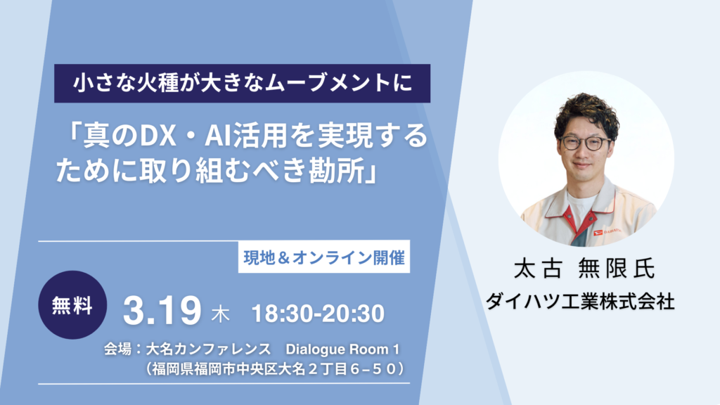ダイハツ工業株式会社の太古無限(たいこ・むげん)氏をゲストに迎え、わずか3人のチームから全社規模のDX・AI活用へと至った、地道で根気強いリアルな実践知を語っていただきました。